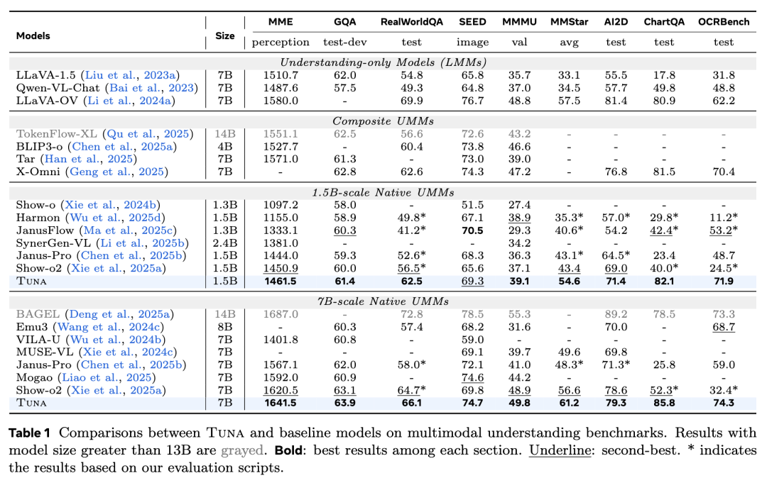 Image Understanding This work evaluates Tuna on nine benchmarks, including MME, GQA, and MMMU. As shown in Table 1 below, both the 1.5B and 7B versions of Tuna achieve state-of-the-art (SOTA) results in almost all benchmark tests. Tuna is not only competitive with pure understanding models but also outperforms many composite UMMs and larger-scale UMMs, demonstrating the effectiveness of unified representation.