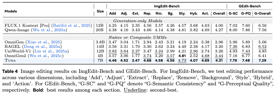 Image editing is evaluated using ImgEdit-Bench and GEdit-Bench. As shown in Table 4 below, Tuna achieves an overall score of 4.31 on ImgEdit-Bench, ranking highest among all UMMs and comparable to pure generative models like FLUX.1. On GEdit-Bench, Tuna scores the highest among all unified models. Figure 7 below displays qualitative results, showing that Tuna can accurately perform operations such as style transfer, environment changes, and object replacement.