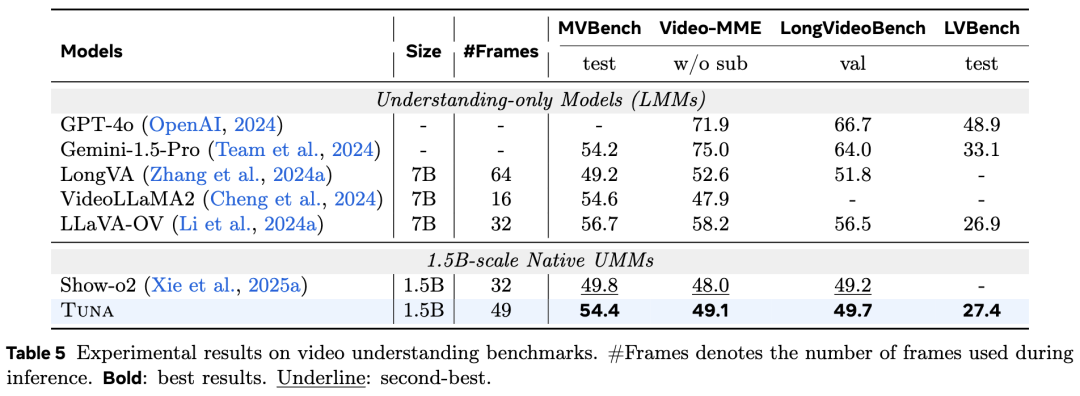The evaluation results of video understanding on four video benchmarks, including MVBench and Video-MME, are shown in Table 5 below. Tuna outperforms Show-o2 on MVBench and Video-MME and demonstrates competitiveness on other benchmarks. Even with a 1.5B parameter model, its performance is comparable to larger pure understanding models.