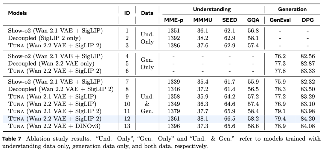 This work validates the effectiveness of the architecture and training strategy through a series of ablation experiments (as shown in Table 7 below):