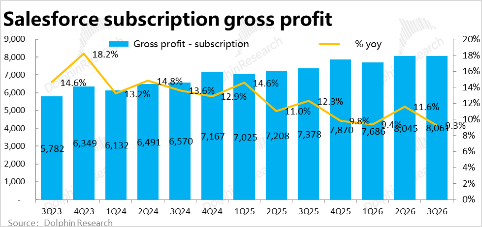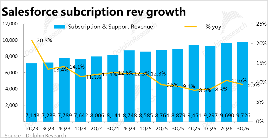 On the growth front, Salesforce's core subscription revenue reached approximately $9.73 billion this quarter, up 9.5% YoY but slowing by another 1.1 percentage points sequentially and slightly missing market expectations. In hindsight, growth remains quite sluggish, showing no signs of acceleration while continuing to decelerate.