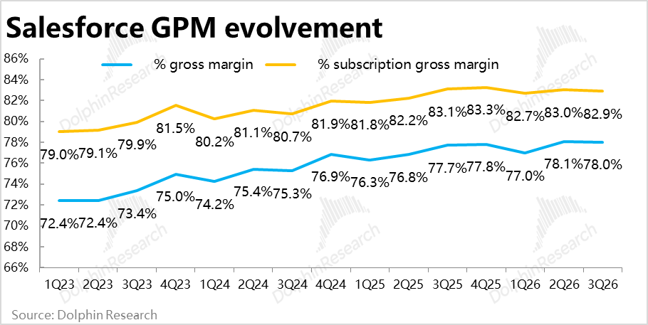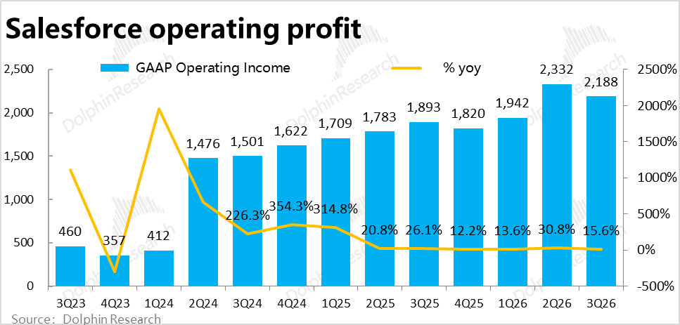 In terms of expenses, Salesforce's total operating expenses for the quarter were $5.82 billion, up 6.8% year-on-year, slightly accelerating from the previous quarter but slightly lower than market expectations and below the growth rates of revenue and gross profit. In other words, expense investments did not significantly increase due to the development of new businesses like Agentforce. Instead, cost control (with operating expense ratios down 1 percentage point year-on-year) offset the impact of weakening gross margins.