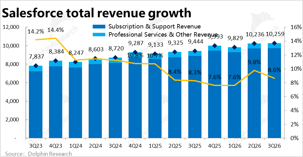 In this quarter, professional services revenue was approximately $530 million, with the year-on-year decline expanding to 5.7%, continuing to weaken. Overall, Salesforce's total revenue was approximately $10.26 billion, up 8.6% year-on-year. After excluding the positive impact of exchange rates, the growth rate was 8%, continuing to slow down and slightly below market expectations.