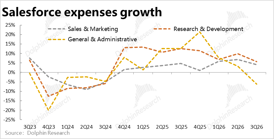 4. Cost control remains excellent: Salesforce's total operating expenses reached $5.82 billion this quarter, up 6.8% YoY, accelerating slightly from last quarter but below market expectations. Marketing and R&D expenses grew at mid-single-digit percentages YoY, while general and administrative expenses declined approximately 6% YoY. The company's spending hasn't significantly increased due to new business developments like Agentforce.