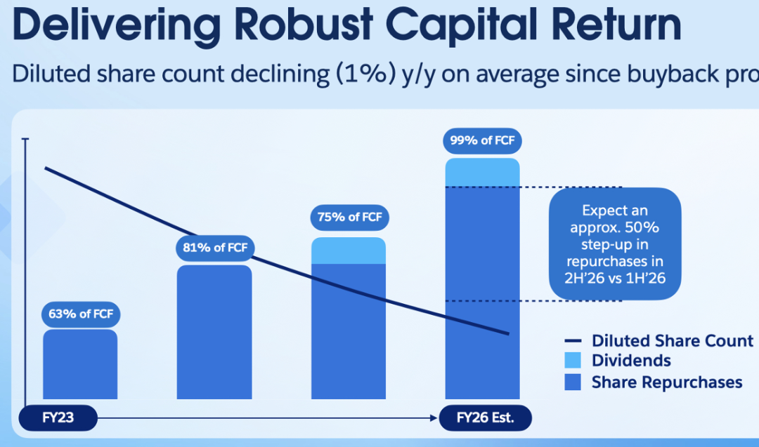 6. Shareholder returns rise as promised: As committed at the previous Dreamforce conference, shareholder returns surged in the second half of the fiscal year. This quarter, the company returned $4.2 billion to shareholders through repurchases and dividends, equivalent to approximately 1.8% of its current market cap—a substantial amount.