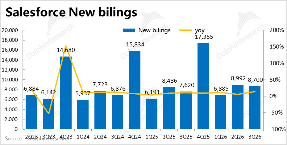 SaaS leader Salesforce announced its Q3 FY2026 financial results (ending October 31) after the U.S. market closed on December 4. Quarterly performance was lackluster, with most key metrics falling short of market expectations. The silver lining was that leading indicators (cRPO and new bookings) showed slight improvement on a low base. Notably, the company guided for significant growth improvement next quarter, primarily due to the consolidation of Informatica. Details are as follows: