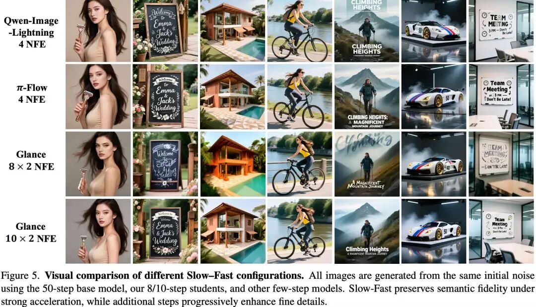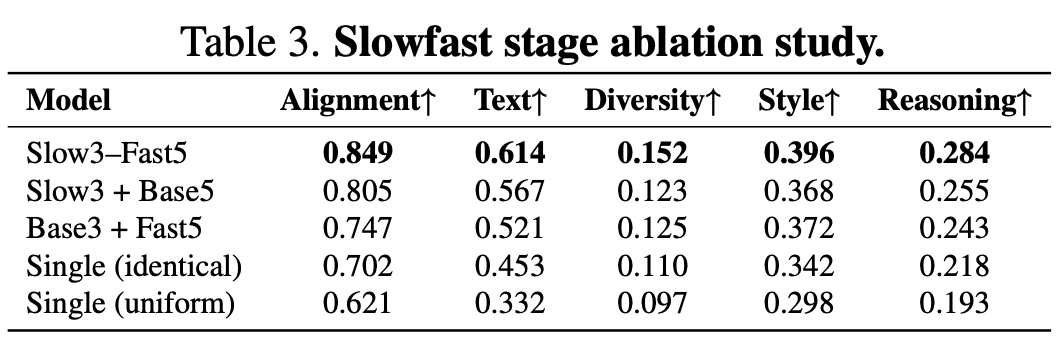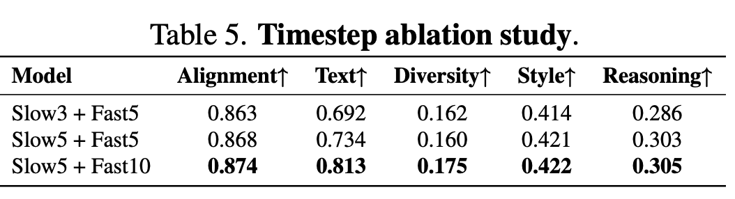 Slow-Fast Design: When comparing various time step allocation strategies, it becomes evident that the asymmetric configuration of “3 slow steps + 5 fast steps” surpasses uniform distributions or single-model configurations. This highlights the necessity of targeted acceleration.