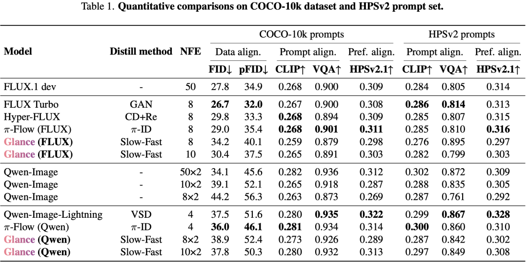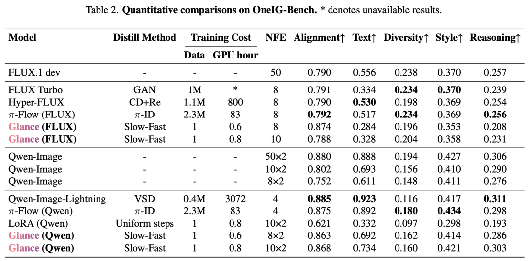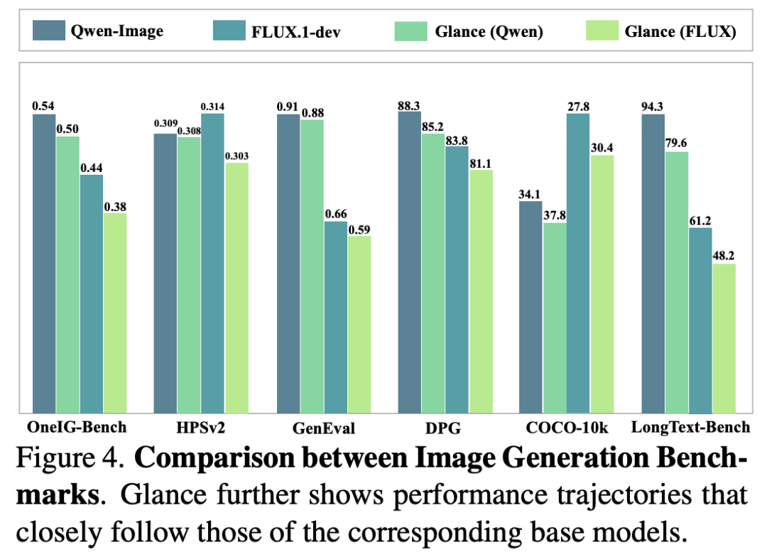Quantitative Comparison: On OneIG-Bench, HPSv2, and GenEval, Glance achieves 92.60%, 99.67%, and 96.71% of the teacher model’s performance, respectively. Even compared to methods requiring thousands of GPU hours of training (e.g., DMD2, Qwen-Image-Lightning), Glance, trained for just 1 hour, demonstrates comparable or superior results.