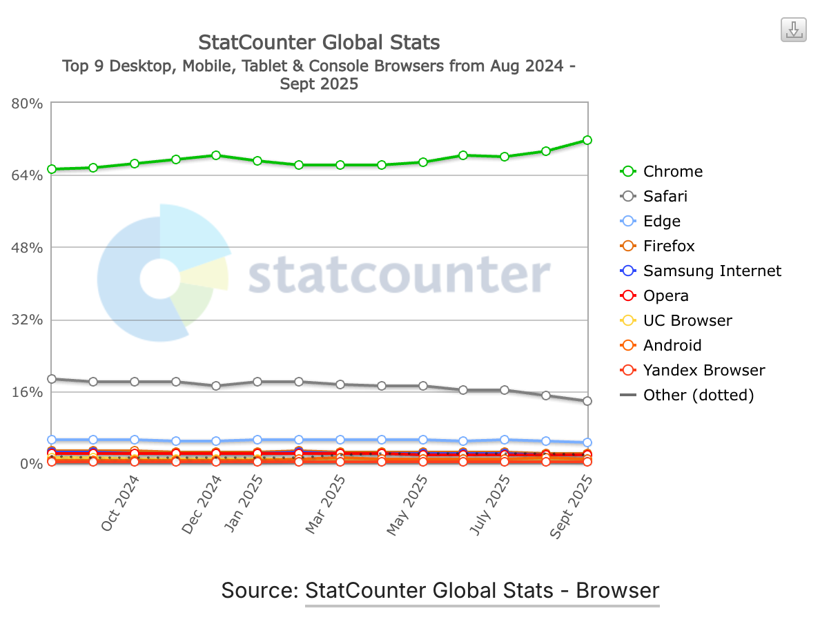 The issue may not lie in Google's inability but rather its reluctance to take risks on Chrome. StatCounter data shows that Chrome's global browser market share has reached a record high of over 70% this year. Unlike startups that can quickly iterate through “continuous innovation,” Chrome, as a “global-scale” product, is unlikely to be “radical” from either a public opinion or business perspective.