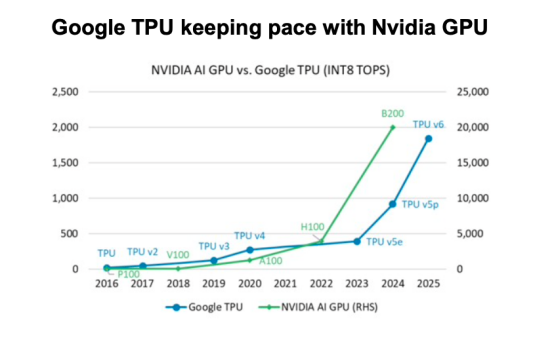 Google's seventh-generation TPU Ironwood already boasts formidable hardware competitiveness, with a peak performance of 4614 TFLOPS at FP8 precision, 192GB of high-bandwidth memory, and significantly superior energy efficiency compared to NVIDIA's B200.