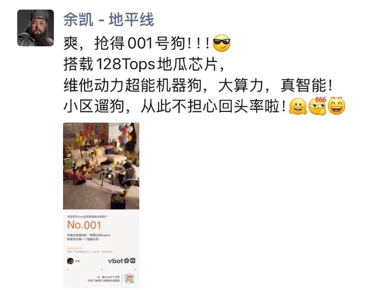Yu Kai, founder and CEO of Horizon Robotics, secured the 001 order immediately upon the pre-sale launch. Wang Cong, CEO of Digua Robotics, also shared his order, confirming that Vbot is equipped with their self-developed S100P chip.