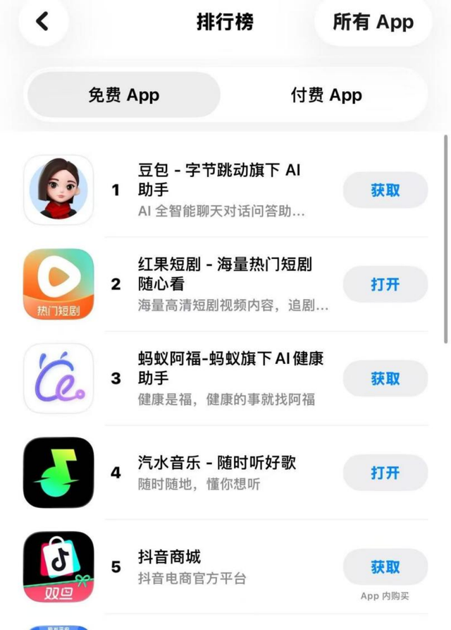 ByteDance boasts five of the top ten free applications in Apple's China region, with Doubao currently ranking first.