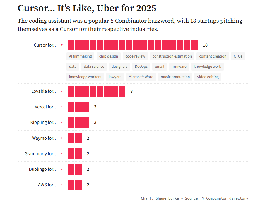 With AI programming tool Cursor surpassing $1 billion in annual revenue, Silicon Valley has witnessed a 'Cursor Effect.' At Y Combinator, 18 startups now claim to be 'the Cursor for [industry]' - spanning from law firms to film sets, as if everything can be 'Cursor-ized.' This homogeneous 'copycat' trend underscores a lack of innovation at the application layer.