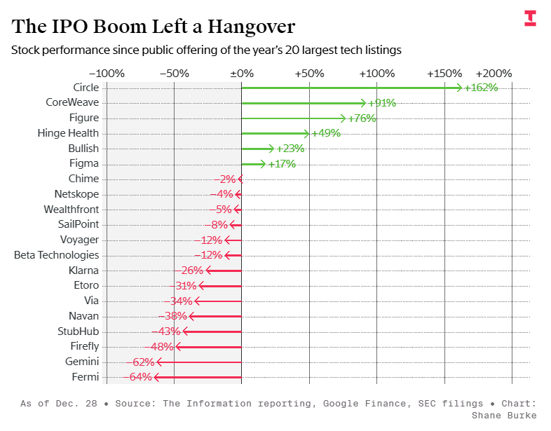 Although the 2025 tech IPO market has finally shown signs of recovery, it feels more like a 'hangover' than a celebration. Among the 23 major tech IPOs this year, over two-thirds ended the year below their offering prices. Even stars like Klarna and StubHub weren't immune to the downturn.