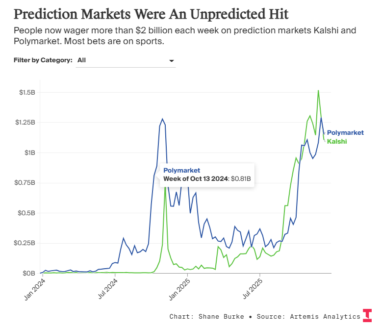 Prediction Markets like Polymarket (think regulated 'betting') have witnessed a surge in popularity this year, with weekly trading volumes exceeding $2 billion. In uncertain 2025, people seem to place more trust in probabilities derived from real money wagers than in expert forecasts.