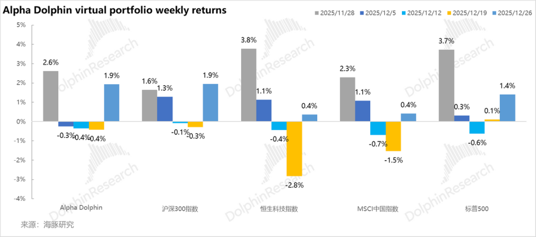 Last week, Dolphin Research's virtual Alpha Dolphin portfolio held steady. It rose 1.9%, matching the CSI 300 (+1.9%) and outperforming the MSCI China Index (+0.4%), Hang Seng Tech Index (+0.4%), and S&P 500 (+1.4%). Recent weeks show strong risk resilience amid market corrections.