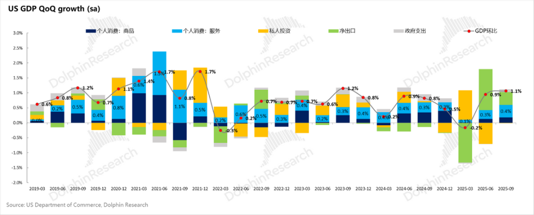 In Q3, U.S. GDP rose 1% quarter-over-quarter, reaching an annualized 4.3%, forming a relatively perfect upward curve. However, Q3 fell after the tariff relief period, during tariff negotiations and reconciliation, so net exports remained a disruptive factor.