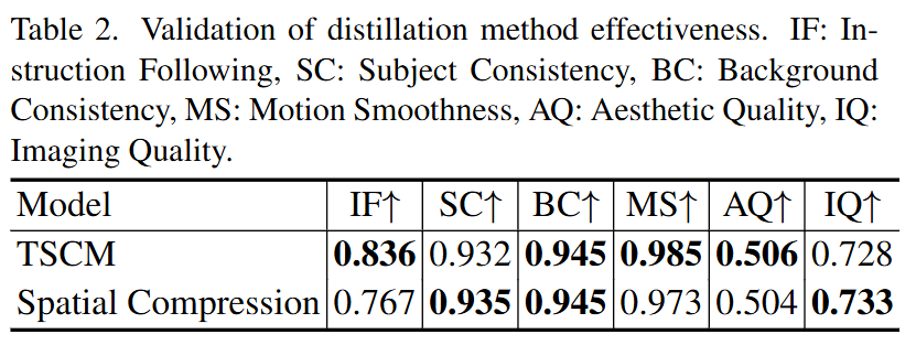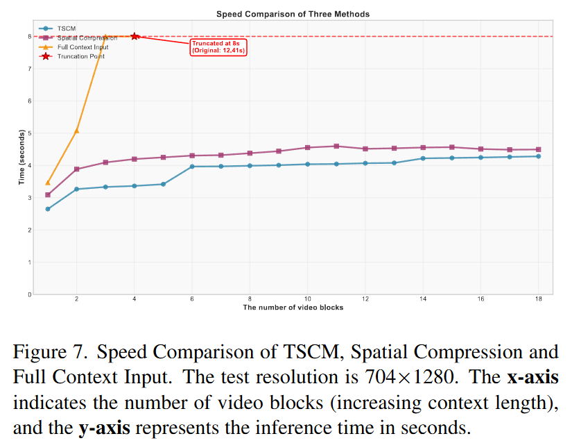 Effectiveness of TSCM: After removing TSCM and replacing it with simple spatial compression, the instruction-following ability dropped from 0.836 to 0.767. Additionally, TSCM enables autoregressive inference time to remain stable as context increases (constant per-step inference time after 8 blocks), while the speed of the full-context input method drops sharply.