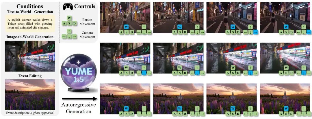 Figure 1. The Yume1.5 framework supports three interactive generation modes: text-to-world generation from descriptions, image-to-world generation from static images, and text-based event editing. All modes are controlled via continuous keyboard input for character and camera movement, enabling autoregressive generation of explorable and persistent virtual worlds. Demonstration videos are included in the supplementary materials.