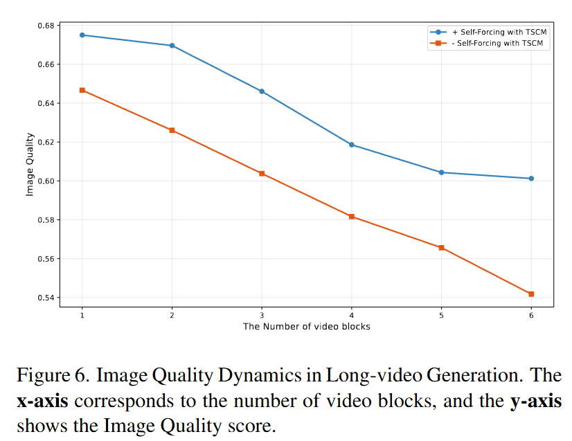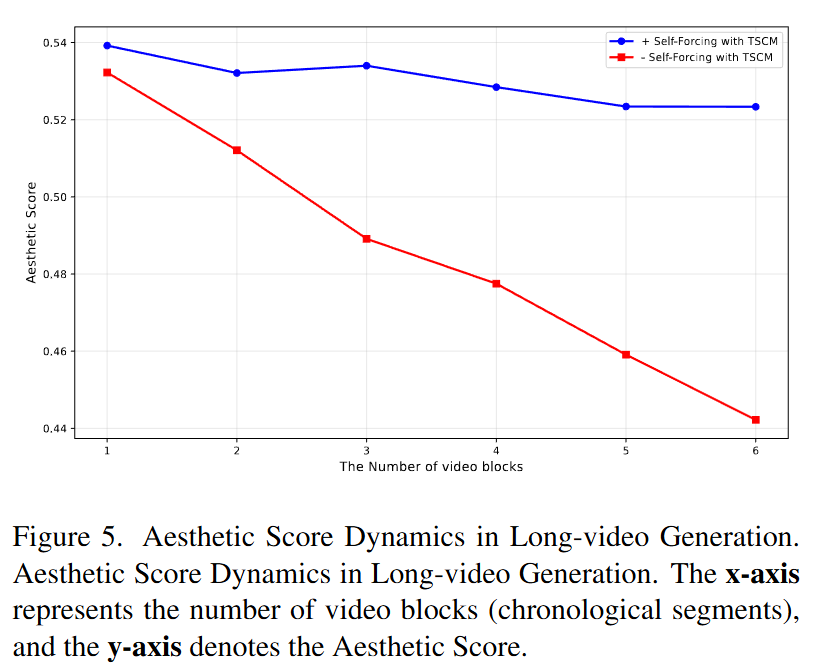 Long-Term Consistency: Through TSCM and Self-Forcing, the model maintains more stable aesthetic and image quality in long-sequence generation, avoiding the sharp decline seen in traditional sliding window methods.