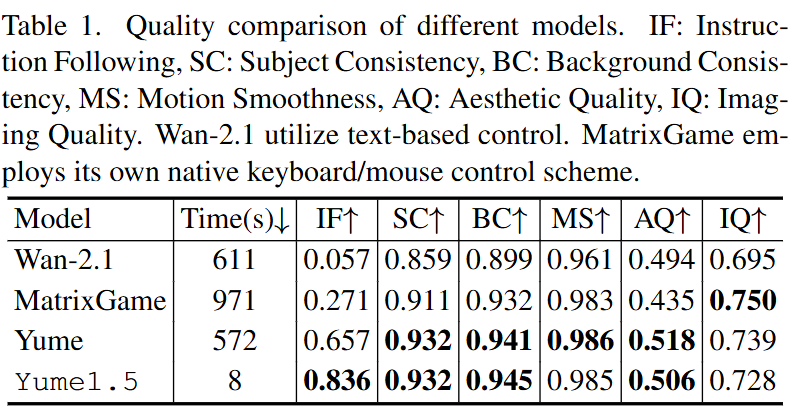 Performance Improvement: On the Yume-Bench benchmark, the Instruction Following score reached 0.836, significantly outperforming Wan-2.1 and MatrixGame.