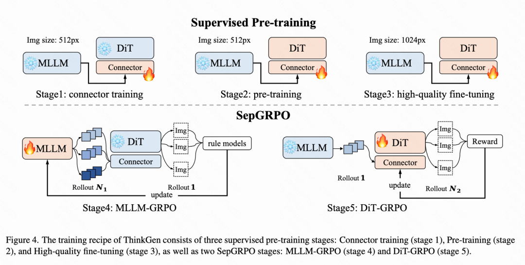 The training of ThinkGen is divided into five distinct stages, as shown in Figure 4 below. Initially, supervised pre-training of the DiT is conducted (Stages 1-3) to ensure high-quality image generation. Subsequently, a separable MLLM and DiT reinforcement learning method called SepGRPO is introduced (Stages 4-5). Through SepGRPO training, the MLLM learns to generate descriptions or editing instructions that best align with the DiT's preferences, while the DiT further optimizes to generate higher-quality images based on these instructions.