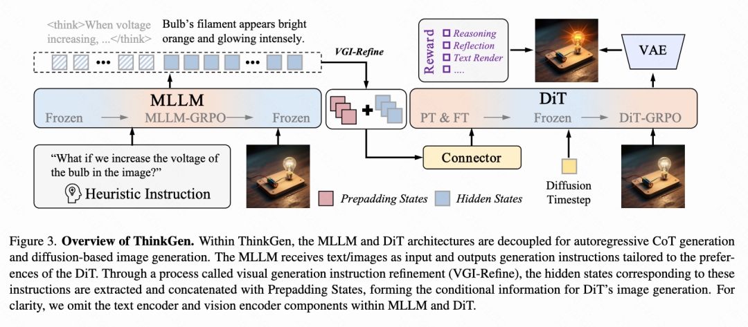 Visual Generation Instruction Refinement (VGI-refine) Module: To address the issue of redundant information during CoT reasoning, the VGI-refine module is introduced. This module extracts concise instructional information from the MLLM's reasoning chain and concatenates it with learnable Prepadding States, enabling adaptive adjustment of the MLLM's representation distribution to better align with the DiT's requirements.