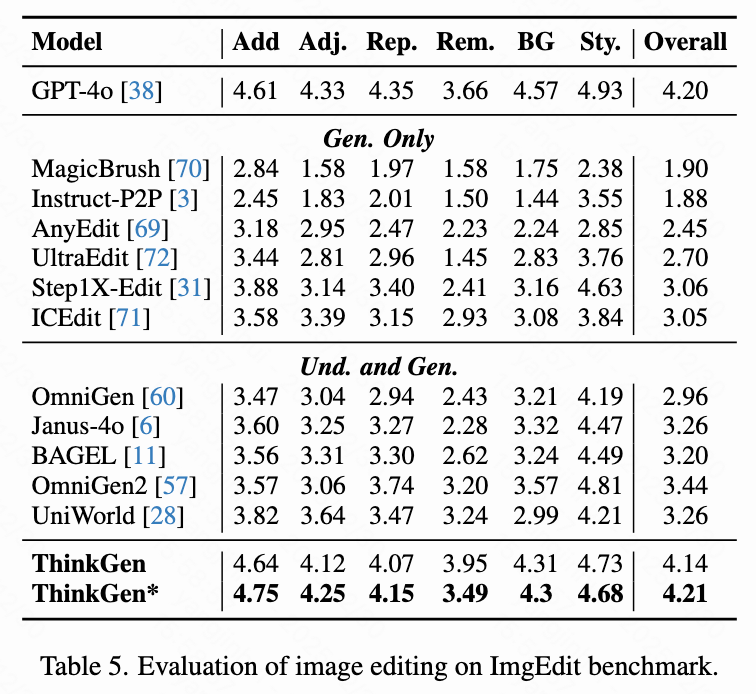 As shown in Table 5 below, on ImgEdit, ThinkGen displays significantly superior metrics compared to a range of open-source models, achieving performance comparable to that of GPT-4o.