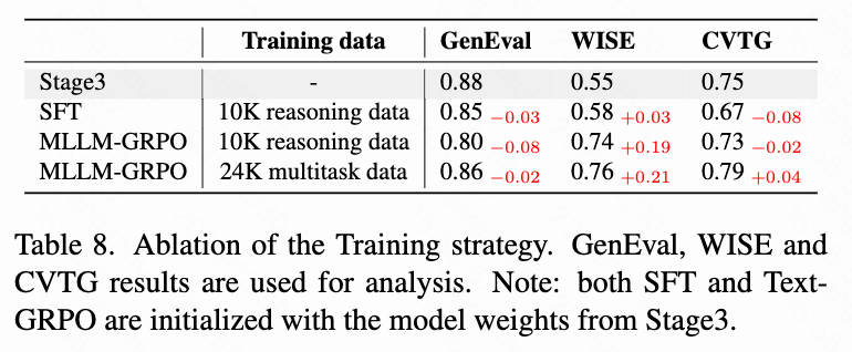 Stage 4 MLLM-GRPO: In this stage, GRPO is applied to the MLLM to encourage the generation of rewritten text aligned with the DiT's preferences. The MLLM is optimized across multiple scenarios to enhance the generalization capabilities of CoT reasoning. Five representative generative scenarios are selected: semantic composition, reasoning generation, text rendering, image editing, and reflection. As shown in Table 1 below, for each scenario, dedicated datasets are collected and curated, and corresponding rule-based models are designed to guide optimization.
