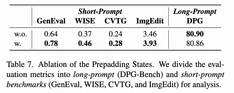Prepadding States: As shown in Table 7 below, pre-padding states significantly improve performance in short-prompt benchmarks (GenEval: 0.64→0.78, WISEBench: 0.37→0.46, CVTG: 0.24→0.28, ImgEdit: 3.46→3.93).