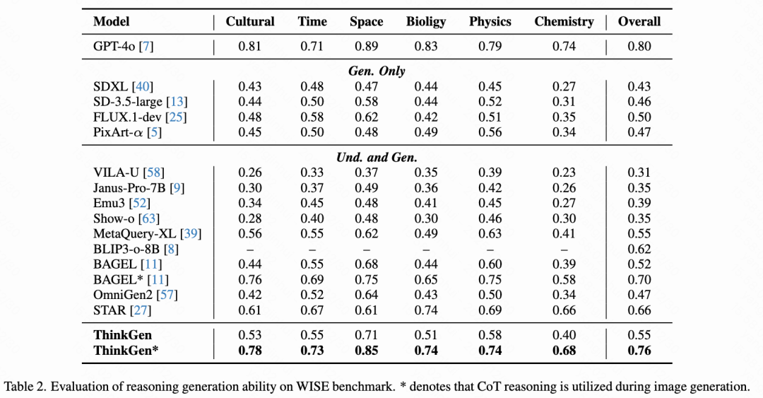 As shown in Table 2 below, on the WISEBench benchmark, ThinkGen exhibits a significant advantage over direct generation methods. By leveraging CoT reasoning, ThinkGen achieves a substantial improvement of +21% (0.55 → 0.76) and establishes a new state-of-the-art performance on WISEBench.