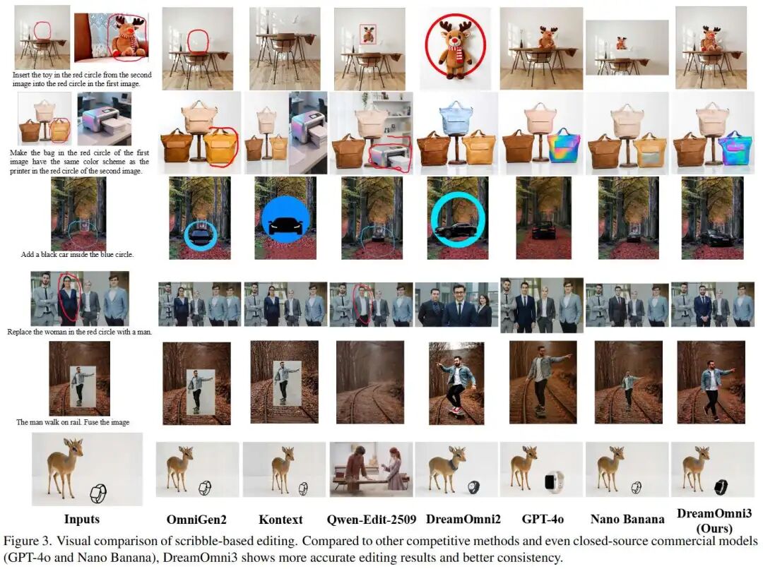 Qualitative Results: As shown in Figure 3 below, DreamOmni3 demonstrated more accurate editing results and better consistency. GPT-4o often exhibited image yellowing and pixel mismatches in non-edited regions, while Nano Banana showed noticeable copy-paste traces and proportional errors.