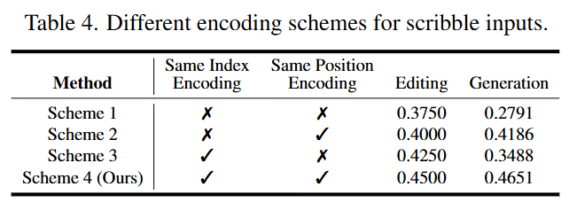 Index and Position Encoding: As shown in Table 4 below, using the same index and position encoding for both the source image and scribble image yields the best results. This facilitates pixel-level alignment and maintains index consistency with subsequent reference images.