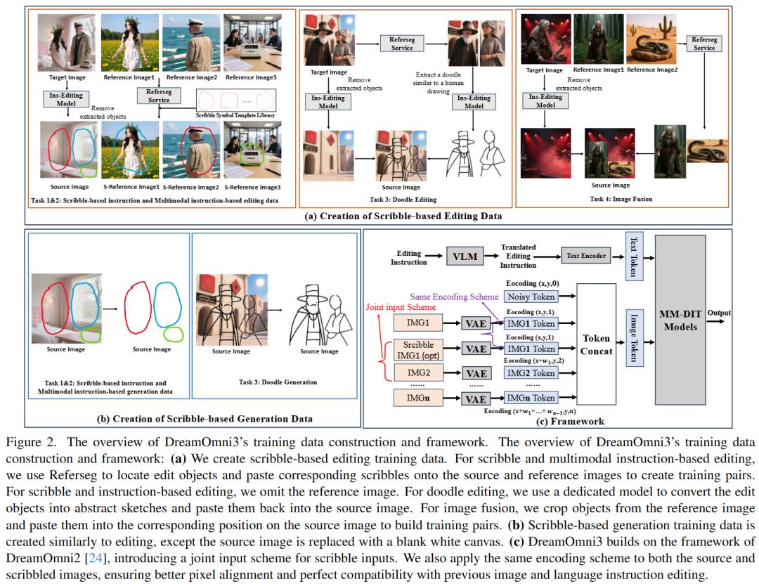 On this basis, DreamOmni3 is introduced, addressing the challenge of limited training data. Using DreamOmni2 data, this work develops a Referseg-based data creation scheme, generating high-quality, precise datasets integrating scribble, text, and image instructions.