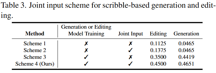 For scribble-based generation tasks, the joint input scheme is also not used, as pixel-level preservation is unnecessary.