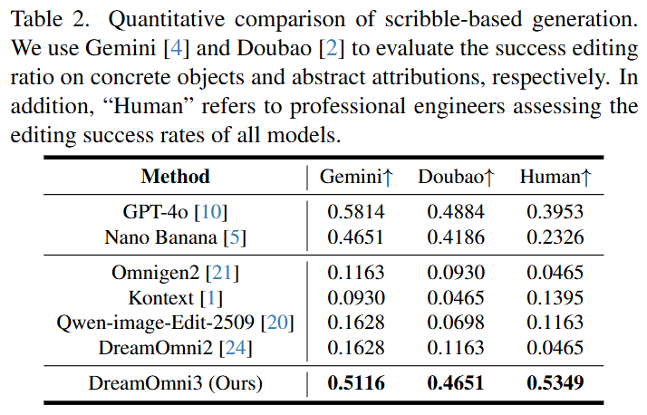 Quantitative Results: As shown in Table 2 below, DreamOmni3 outperforms Nano Banana in both human evaluation (0.5349) and model evaluation, and performs comparably to GPT-4o. Existing models (including GPT-4o) often fail to remove scribble traces in generated results and are not optimized for such tasks.