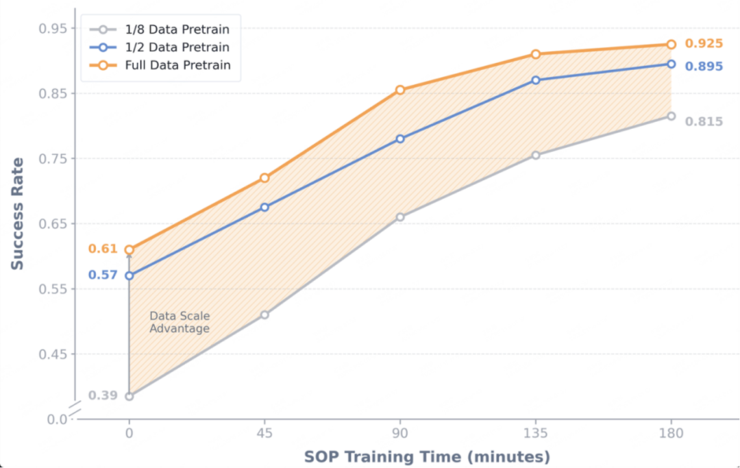 SOP achieved approximately 30% performance improvement with just three hours of on-policy experience, while 80 hours of additional human expert data only brought a 4% improvement. This indicates that SOP can efficiently break through VLA performance bottlenecks when pre-training shows diminishing marginal returns.