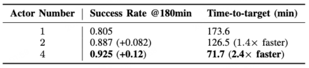 The research team believes that multi-robot data collection effectively prevents model overfitting to specific characteristics of a single robot. Meanwhile, SOP translates hardware scalability into significant reductions in learning duration, with a quad-robot cluster increasing training speed to achieve target model performance by 2.4 times compared to a single robot.