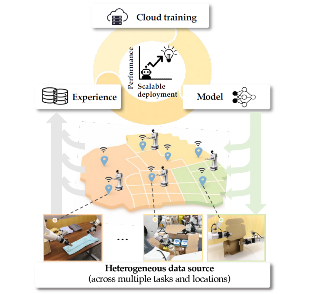 Robot clusters continuously collect empirical data across various tasks, transmitting interaction data in real-time to a centralized cloud server and asynchronously receiving updated control policies—enabling VLA models to enhance task execution proficiency while maintaining versatility.
