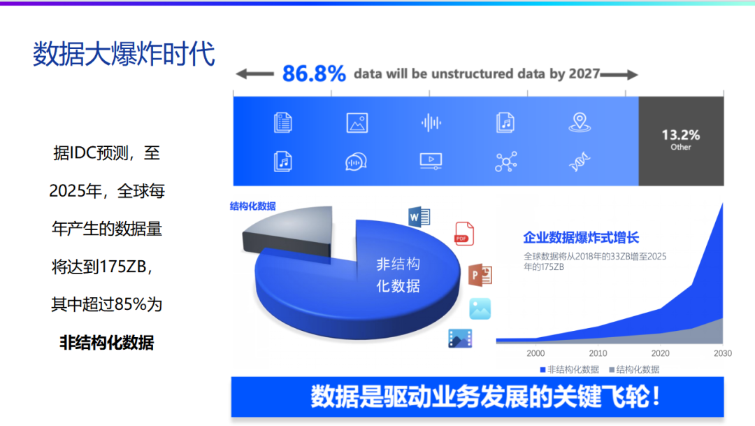 Consider the variety of information we receive daily. Besides textual data, a significant portion comes from videos, audio, and other formats. In reality, the proportion of unstructured data in our lives is far greater than many might realize. This pie chart effectively illustrates the proportion of information in our daily information intake, with unstructured data clearly holding a dominant position. Of course, in the realm of computer science or data governance, the application of unstructured data is still in its nascent stages.