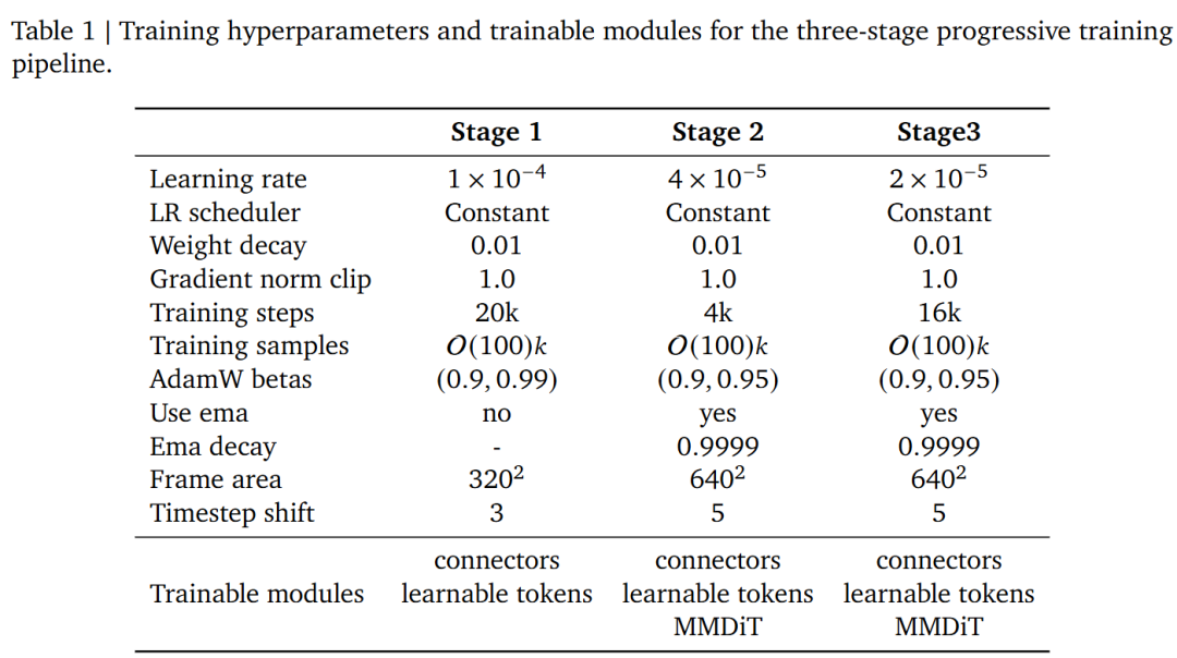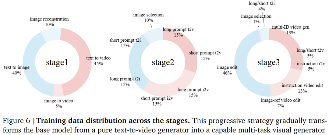 To build a unified visual generator supporting multimodal conditions, this work starts with a text-to-video diffusion model, as it already provides a strong temporal dynamic prior. To replace the original text encoder, the VLM's output space is first aligned with the model's native text encoder. During this initial stage, only a two-layer MLP connector is trained to map between the two embedding spaces. Modern text-to-video models typically rely on long, well-structured text prompts, while editing tasks often involve short instructions, creating a distributional gap. To bridge this gap, this work adopts a progressive training strategy, gradually transitioning the input condition distribution. Specifically, short prompts are treated as an intermediate form between long prompts and concise editing instructions. In the second stage, the model is trained with a mix of long and short prompts to ensure robustness to both forms, and MMDiT parameters begin to be updated at this stage. Once the model adapts to short prompt inputs, it proceeds to the final stage for full multi-task mixed training. The data mixing ratios for each stage are shown in Figure 6. This enables the model to smoothly transition from structured text-video conditions to instruction-based multimodal generation and editing.