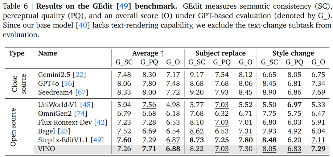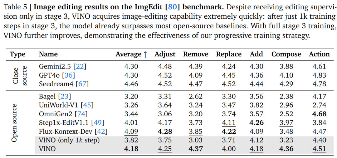 Image Editing: In the ImgEdit and GEdit benchmarks, VINO rapidly surpasses most open-source baselines in editing capabilities after undergoing only a small amount of training in Stage 3 (1k steps). This is attributed to the strong instruction-following ability brought by progressive training.