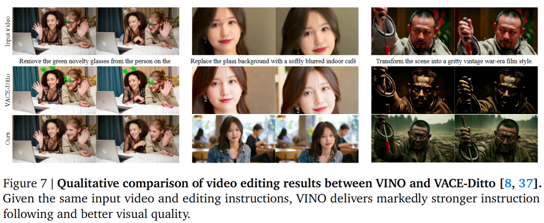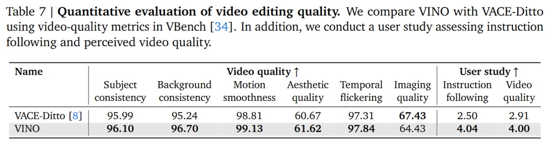 Instruction Adherence and Consistency: Compared to baseline models, VINO performs better in following complex instructions and preserving identity features (ID preservation) of reference images/videos, especially in multi-identity editing scenarios.