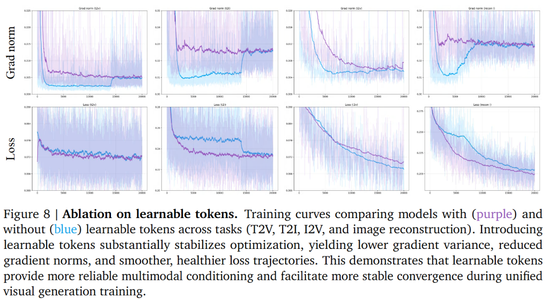 Role of Learnable Tokens: Introducing learnable tokens significantly enhances training stability (smoother optimization curves) and improves the fidelity of multimodal conditions. Removing these tokens leads to increased gradient noise and degraded performance in tasks such as object removal/replacement.