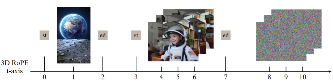 While VLM provides robust high-level multimodal semantics, it significantly compresses visual information, resulting in a lack of fine-grained spatial details and texture fidelity. Consequently, it cannot adequately handle tasks requiring precise structural control, such as local editing. To compensate for this information bottleneck, this work supplements VLM embeddings with VAE-encoded latent variables from all visual modalities. As shown in Figure 5, these VAE latent variables are arranged in the same order used in VLM, with noisy image/video latent variables placed at the end. However, simply concatenating image and video latent variables introduces ambiguity. To uniquely distinguish different visual conditions and align each VAE latent variable with its corresponding VLM features, this work reuses VLM's <|vision_start|> and <|vision_end|> embedding vectors. After projecting these embeddings through an MLP to match the MMDiT input dimension, they are used to mark the boundaries of each visual latent variable block. This explicit boundary marking serves as a strong positional cue, allowing the attention mechanism to correctly and effectively partition and interpret different visual condition inputs in the sequence.