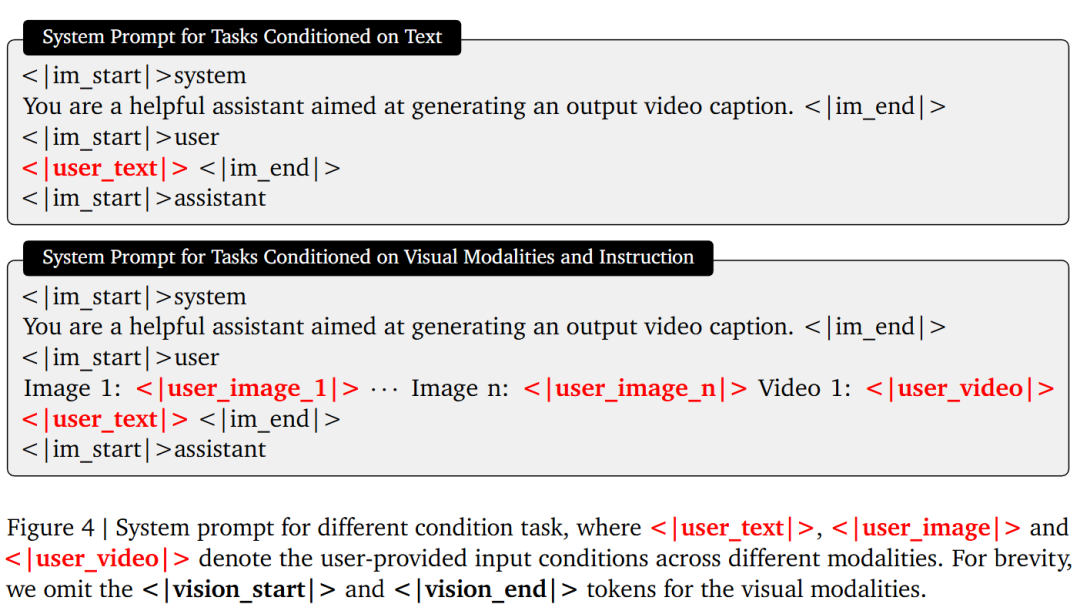 To handle various forms of input, this work employs a frozen VLM model as the front-end encoder for all language and visual conditions. As shown in Figure 4, the system prompt adapts based on the presence and quantity of input modalities. When no visual modality is provided, users supply only text input, serving as the sole condition for text-to-image or text-to-video generation. When visual inputs are present, they are first sorted by type (images first, then videos) and placed at the beginning of the prompt, with each input assigned a unique identifier such as Image 1 or Video 1. Users can then reference these identifiers in the text input to specify different visual conditions, enabling complex multimodal control. Additionally, a set of learnable Tokens is appended to the end of the prompt, extracting cross-modal features into a shared space. These Tokens are also processed using causal masking rather than full bidirectional attention. Finally, the hidden states from the second-to-last layer of the VLM are used as the encoded conditions, projected via a two-layer multilayer perceptron (MLP) for feature projection before being input into the subsequent MMDiT.