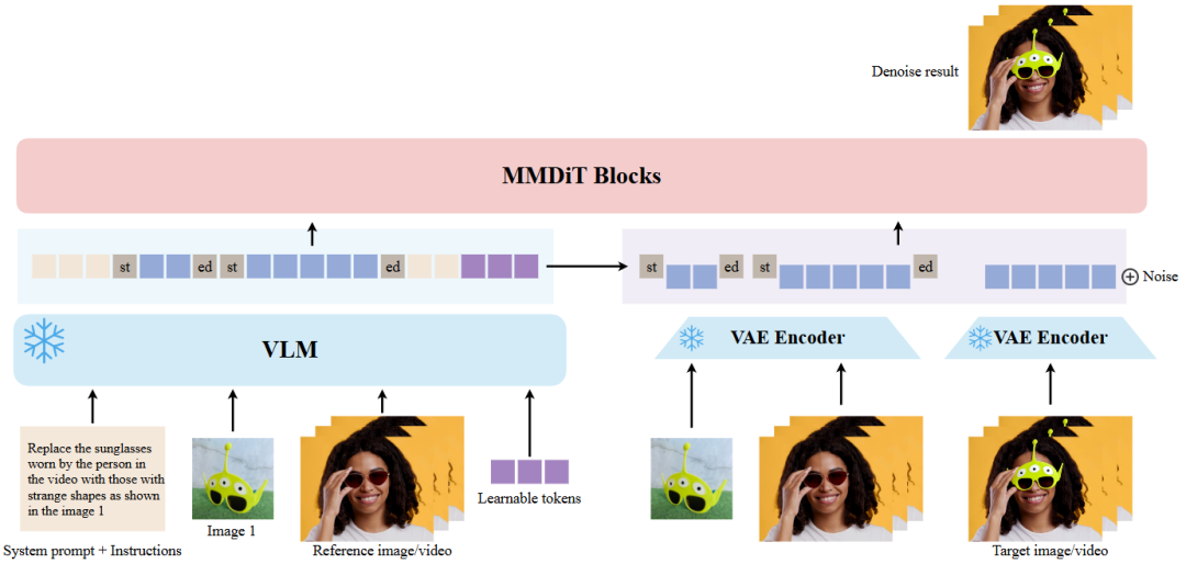 Shared Boundary-Marked Latent Variable Injection: To compensate for VLM's loss of detailed features, VAE latent variables from reference images/videos are injected into MMDiT. The key technology involves reusing VLM's <|vision_start|> and <|vision_end|> Tokens to mark the boundaries of VAE latent variables, ensuring correspondence between semantic and latent features.