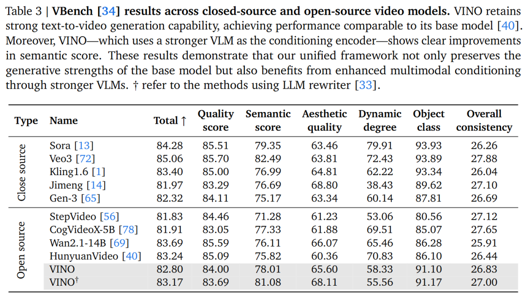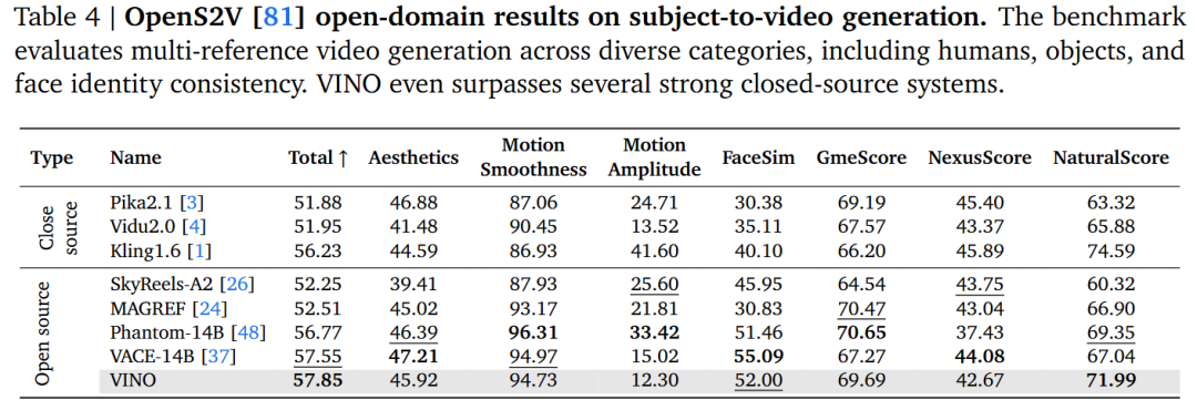 Reference-Based Generation Capabilities: On the OpenS2V benchmark (for subject-specific video generation), VINO demonstrates a clear advantage, effectively generating customized videos based on reference images.