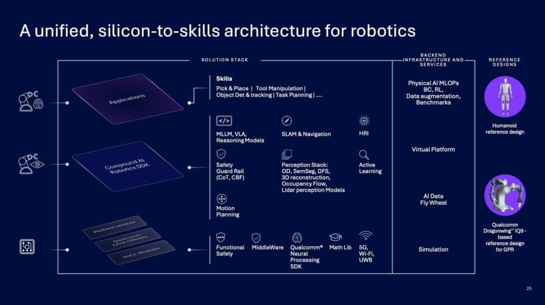 Leveraging its long-standing strengths in high-performance, low-power SoCs, and edge AI, Qualcomm has proposed a versatile robot architecture. This architecture spans a broad spectrum, from household service robots and industrial AMRs to full-size humanoid robots endowed with reasoning, adaptation, and decision-making capabilities.