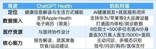 ▲There are notable disparities in the core capabilities and product positioning between ChatGPT Health and Ant Afu.